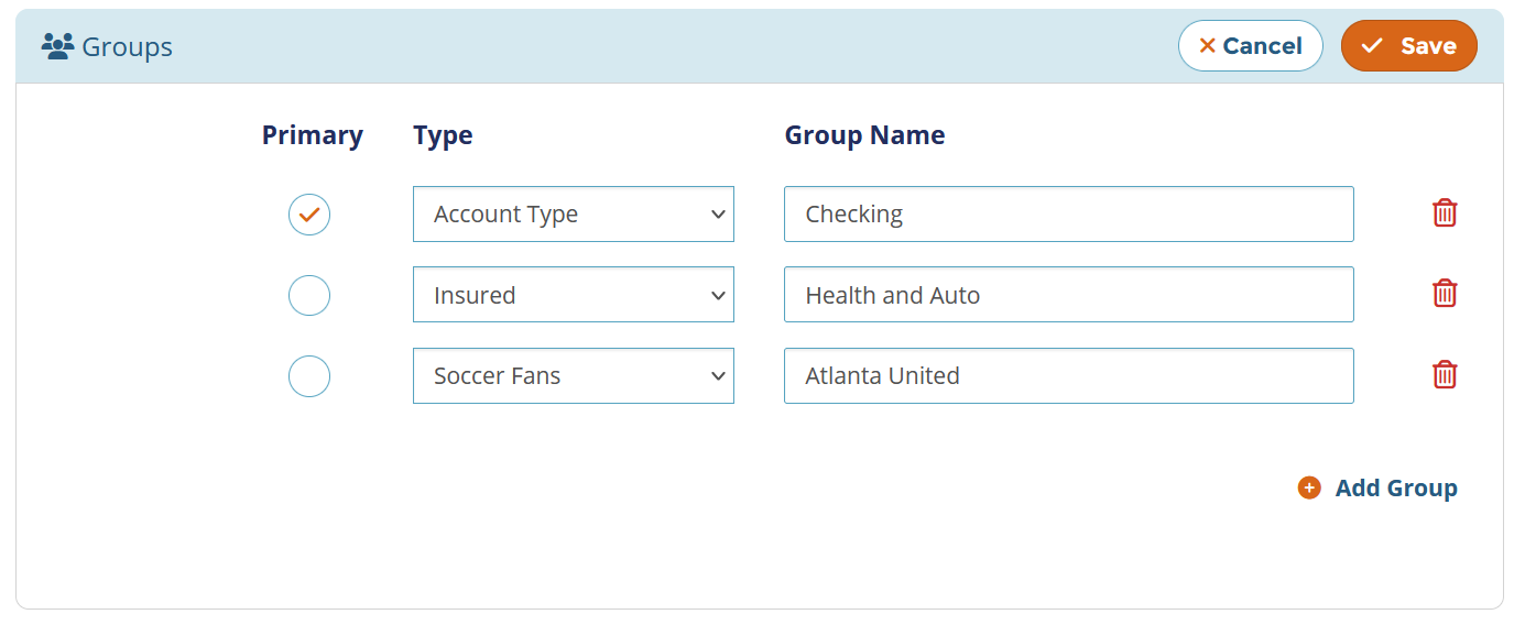 Group Types are used for classifying Groups. For example, you can set up groups named “Family”, “Football Fans”, “Employee”, etc. which can be used to connect a set of user profiles based on collective interests and characteristics. When assigning a user profile to a Group, you pass in a Group Name and associate it with any of the available Group Types.